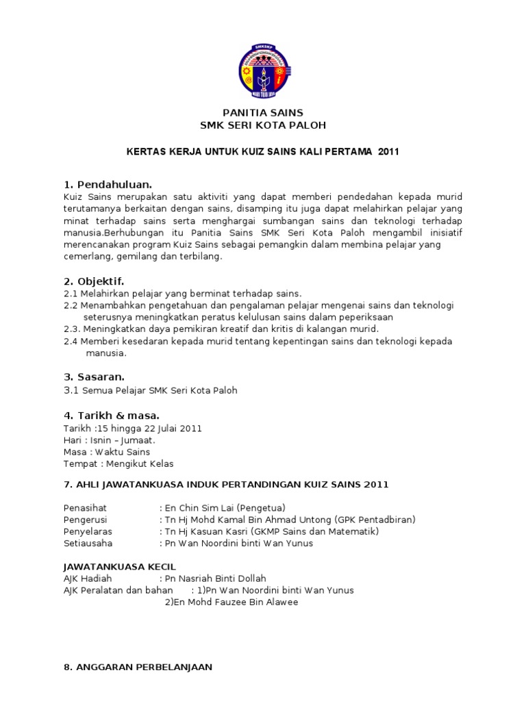 Kertas kerja lengkap dengan contoh aktiviti perbelanjaan dan ajk. Pada tahun ini panitia di bawah bidang Sains akan meneruskan lagi program tahunan panitia dengan mengadakan program Minggu Sains. Dataran Budi SMK Beserah Semua pelajar dan guru 1200 pm110 pm Tingkatan 1 Kuiz sains Tingkatan 2 KUiz sains Tingkatan 3 Kuiz matematik maths magic Tindakan.